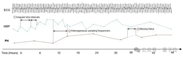 图2医学时间序列数据具有以下特点:①时间间隔不规则,②采样率异质,③由于临床工作流程不标准或仪器按照不到位造成的数据缺失。