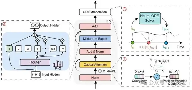 MIRA的架构如下:①接收不规则时间序列和时间戳作为输入,并应用CT-RoPE进行连续时间编码。②混合专家层根据频率路由到不同的Expert。③Neural ODE模块将潜在状态演化到任意目标时间戳,从而实现灵活的时间感知预测